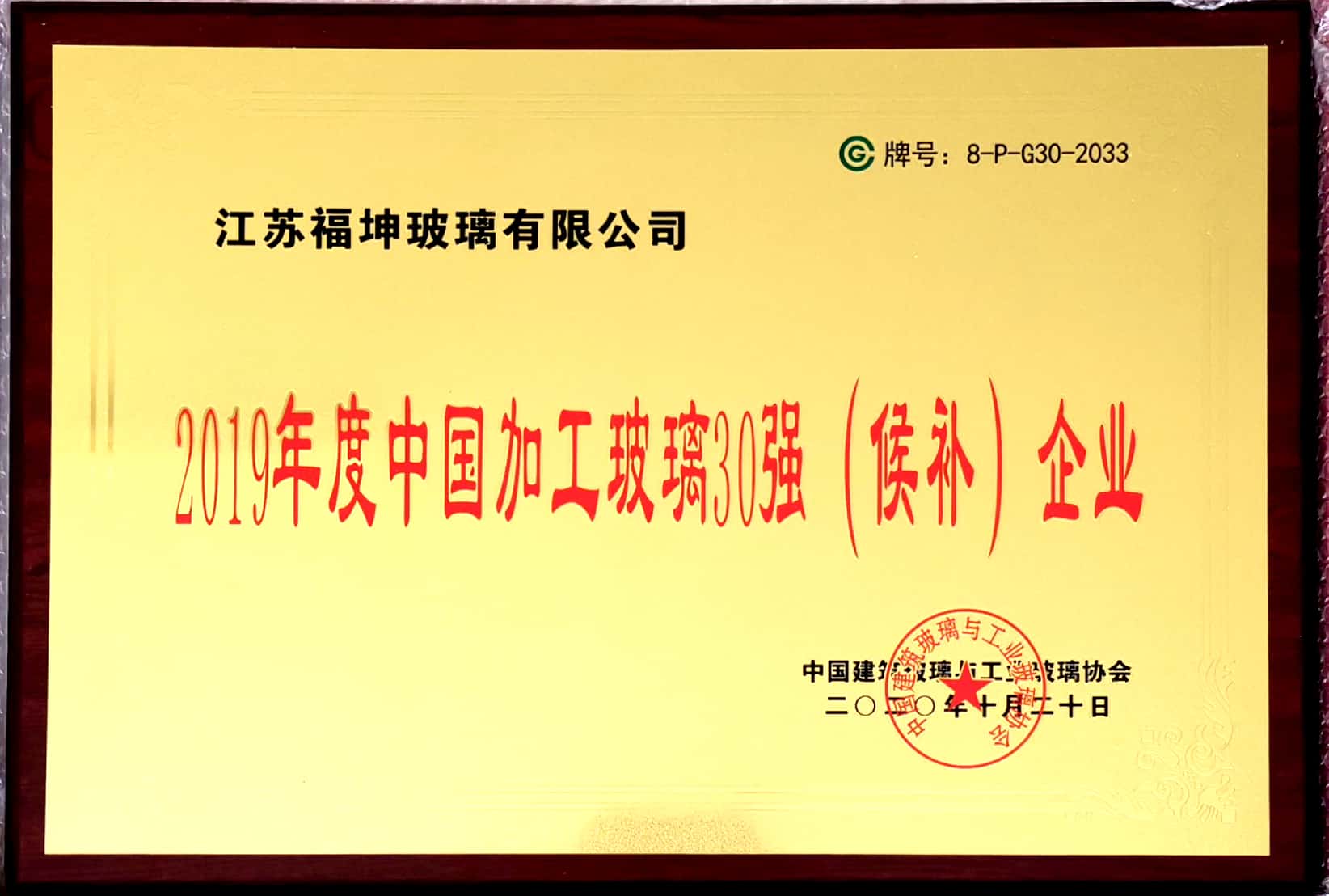 2020年10月20日-21日,由中国建筑玻璃与工业玻璃协会主办的“第八届中国加工玻璃行业领军企业家峰会"”(简称“G30峰会”)在四川成都召开。江苏福坤玻璃有限公司荣膺“2019年度中国加工玻璃30强(候补)企业”称号。 G30峰会是由中国建筑玻璃与工业玻璃协会筹备通过评选产生的在玻璃工艺、加工、设计、机械装备等领域排名前30名企业召开的行业峰会。会议每年10月份召开,旨在分析当前国内外行业动态与经济发展形势,征集、讨论制约行业与企业发展的难题,制订峰会“行动计划”,助力行业与企业的未来发展,是倍受关注的盛会。 江苏福坤玻璃有限公司具有多年的玻璃深加工经验,历来注重新品研发和品质建设,企业管理独具特色,2019年荣获泰兴市市长质量奖提名奖,在行业内名不见经传,企业经过多次转型升级,已发展成长为以建筑工程玻璃加工为主线,具有研发和生产各类复合防火玻璃、防火门窗的综合型企业。 福坤玻璃荣膺“2019年度中国加工玻璃30强(候补)企业”称号,是对我司2019年取得业绩的充分肯定,更是对福坤玻璃建设品质福坤战略目标的实现带来巨大信心与动力。 | |